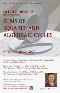 Stony Brook Lectures in Algebraic Geometry Speaker: Olivier Benoist (DMA ENS, Paris) Lecture Series Title: Sums of squares and algebraic cycles Lecture 1: Tuesday, October 28 at 4:00pm, SCGP Room 102 … Read more