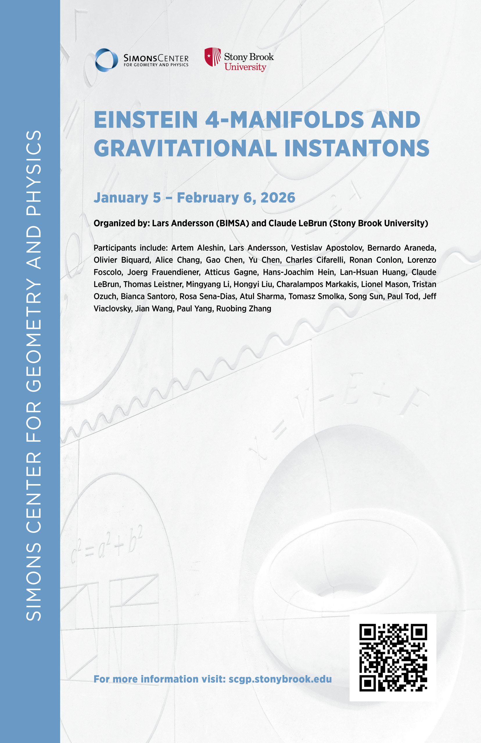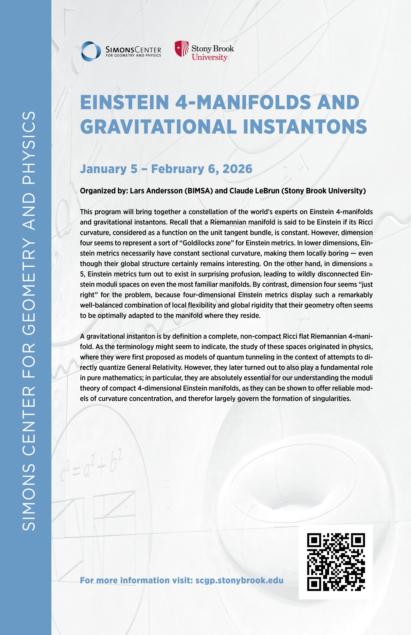 This program will bring together a constellation of the world’s experts on Einstein 4-manifolds and gravitational instantons. Recall that a Riemannian manifold is said to be Einstein if its Ricci curvature, considered as a function on the unit tangent bundle, is constant. However, dimension four seems to represent a sort