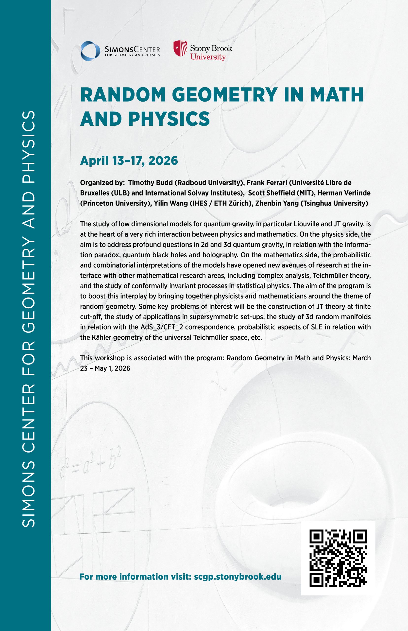 The study of low dimensional models for quantum gravity, in particular Liouville and JT gravity, is at the heart of a very rich interaction between physics and mathematics. On the physics side, the aim is to address profound questions in 2d and 3d quantum gravity, in relation with the information paradox, quantum black holes and holography. On the mathematics side, the probabilistic and combinatorial interpretations of the models have opened new avenues of research at the interface with other mathematical research areas, including complex analysis, Teichmüller theory, and the study of conformally invariant processes in statistical physics. The aim of the program is to boost this interplay by bringing together physicists and mathematicians around the theme of random geometry. Some key problems of interest will be the construction of JT theory at finite cut-off, the study of applications in supersymmetric set-ups, the study of 3d random manifolds in relation with the  correspondence, probabilistic aspects of SLE in relation with the Kähler geometry of the universal Teichmüller space, etc.