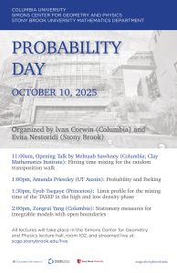 Columbia University, Simons Center for Geometry and Physics, Stony Brook University Mathematics Department: Probability Day Organized by Ivan Corwin (Columbia) and Evita Nestoridi (Stony Brook) Schedule of talks *All talks will take place in SCGP Room 102* 11:00am – 12:00pm Speaker: Mehtaab Sawhney (Columbia; Clay Mathematics Institute) Title: Hitting time mixing for the random transposition … Read more